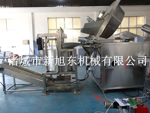 奉賢食品定做油炸機、連續式甩油機、輸送機等設備適合炸制堅果類食品的油炸。炸制完產品后自動出料至連續式甩油機把產品甩油完。通過輸送機輸送至其他設備中。方便、快捷、提高效率、生產量大。